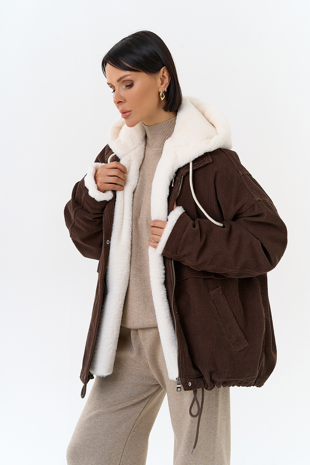 Крой воротника - съемный капюшон, отделка эко мех